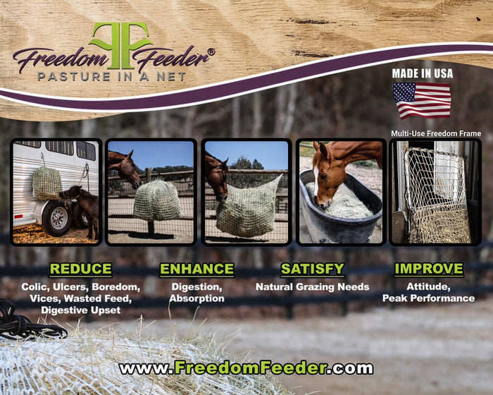 Freedom Feeder nets are regularly recommended by Veterinarians, Equine Hospitals, Equine Dentists and Equine Nutritionists including Juliet M. Getty, PhD (author of Feed Your Horse Like a Horse) and Chaire Thunes PhD Nutrition, University of California Davis, Summit Equine Nutrition.
